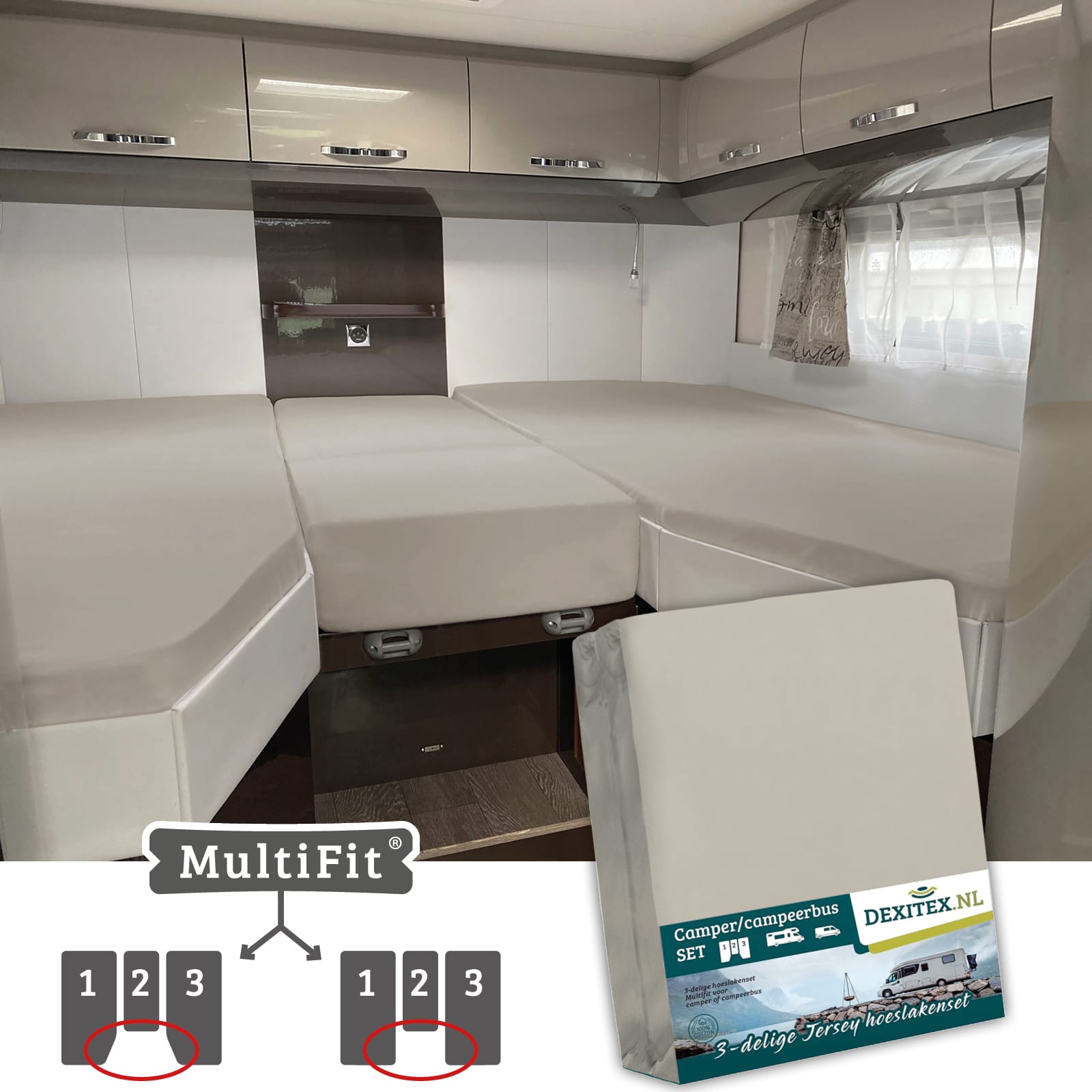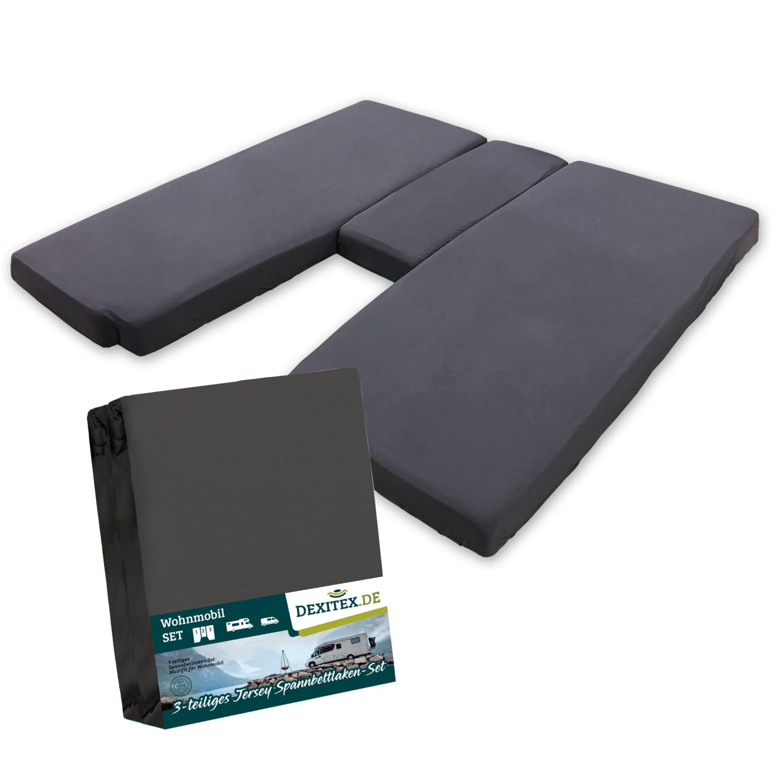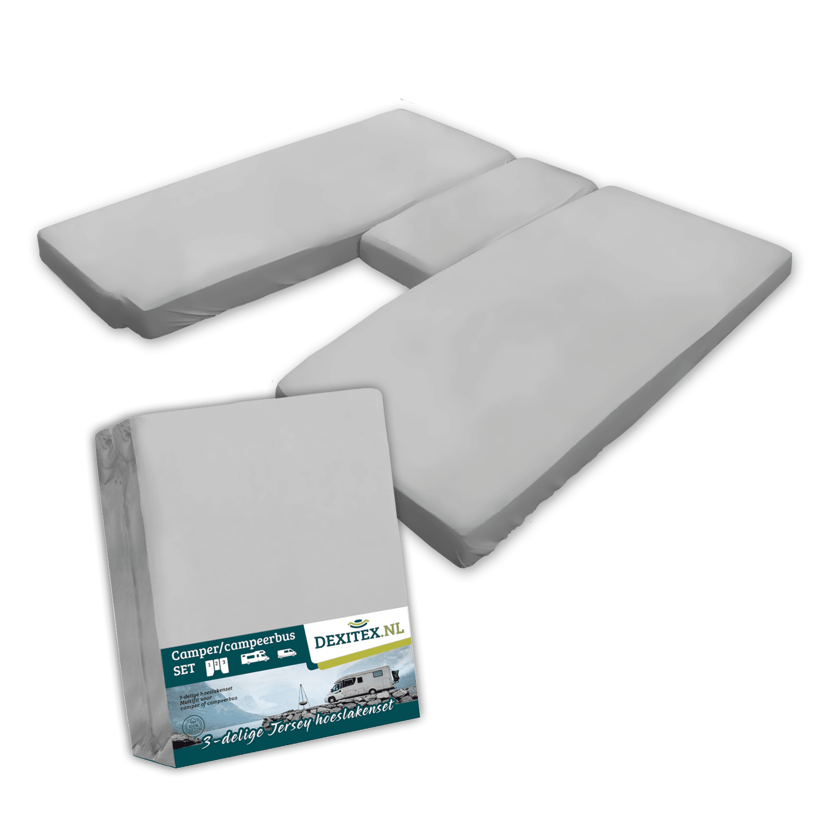 This fitted sheet set is specially designed for the 3-piece mattress layout in a camper or caravan. It contains three extra-thick jersey fitted sheets. One for the left mattress, one for the right mattress, and a custom-made one for the center section. This ensures all three mattresses are perfectly and neatly made.
